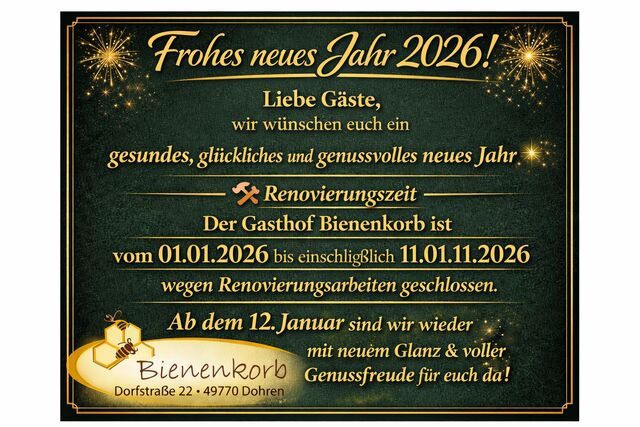 Genießen Sie das warme Ambiente und die Gastfreundschaft des Gasthof Bienenkorb in Dohren. Ein herzliches Willkommen! Sie werden mit echter Gastfreundschaft und einer großartigen Auswahl an deutscher Küche begrüßt. Nehmen Sie Platz und genießen Sie unsere gekonnt zubereiteten Burger, Schnitzel und Salatbar, die für jeden Geschmack etwas bieten. Erfrischendes Bier, Wein, Kaffee und Tee stehen ebenfalls für Sie bereit. Genießen Sie ein schmackhaftes Abendessen in ruhiger, entspannter Umgebung.